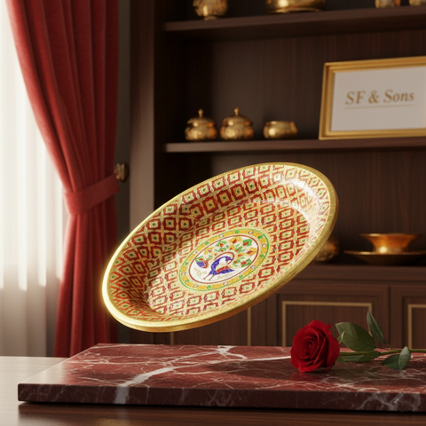 Enhance your space with the timeless charm of the SF Meenakari Brass Parat, a stunning blend of tradition, durability, and artistry. Handcrafted in India, this round brass parat features exquisite Meenakari work with vibrant multicolor patterns, and a beautifully detailed peacock design at the center – a symbol of grace and tradition in Indian culture.