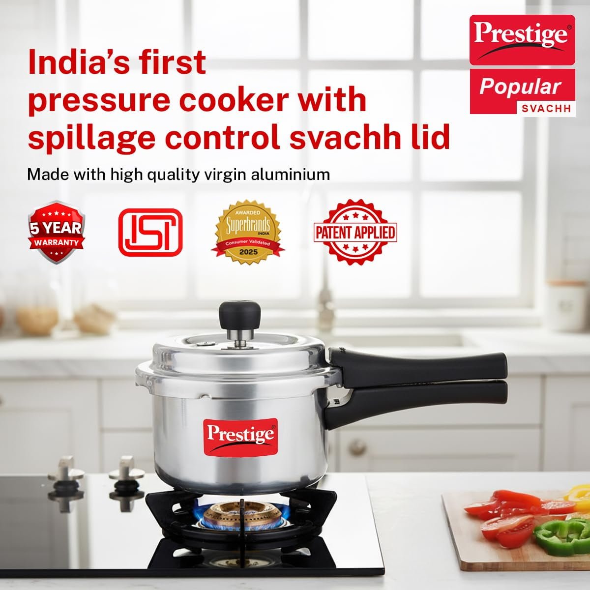 The Prestige 1.5 – 2 -3 -4 -5 Litre Aluminium Popular Svachh Outer Lid Pressure Cooker is a reliable and efficient kitchen companion for everyday cooking. Crafted from premium virgin aluminium, this cooker ensures fast and even heat distribution for quicker cooking while saving fuel.