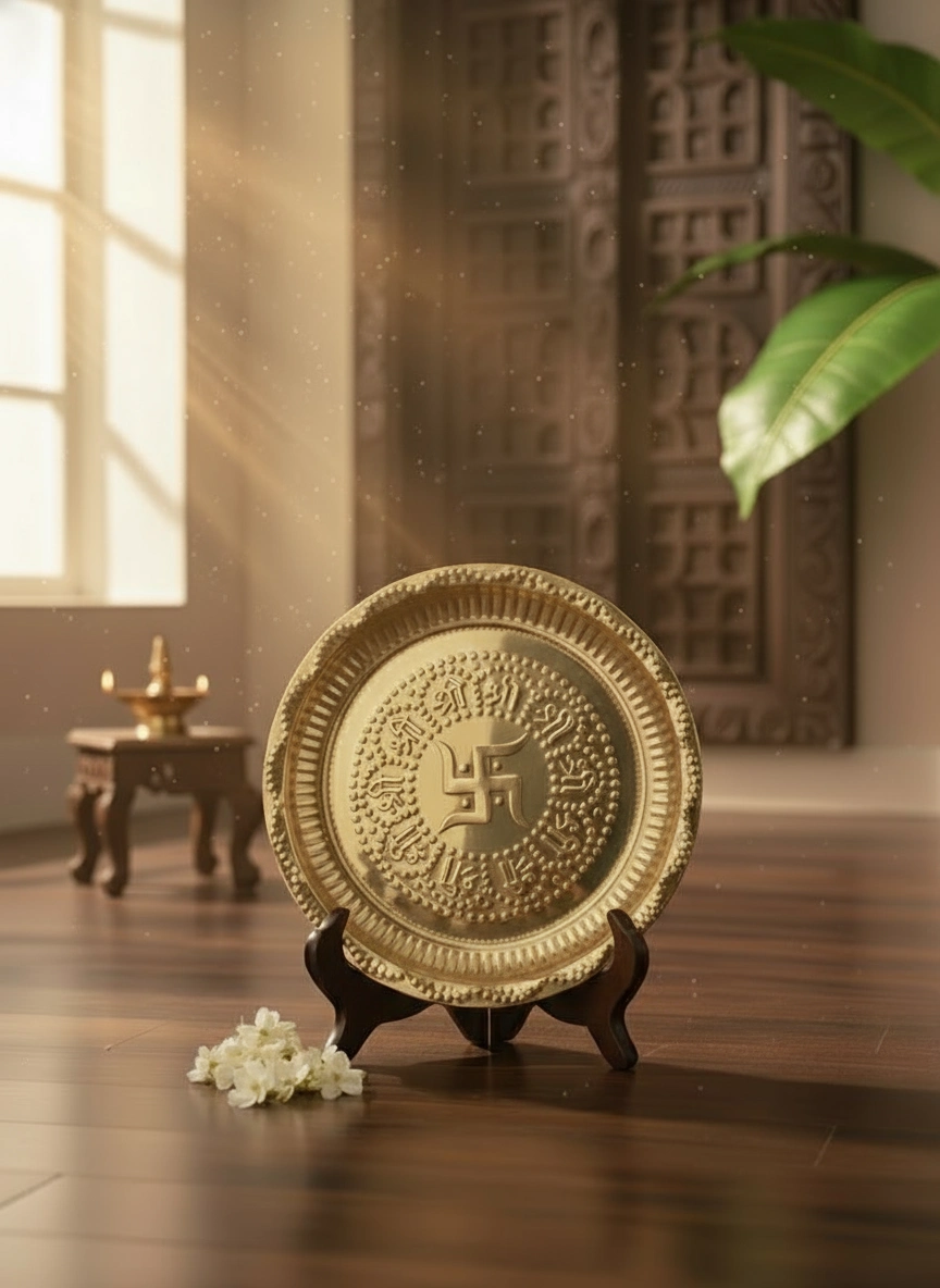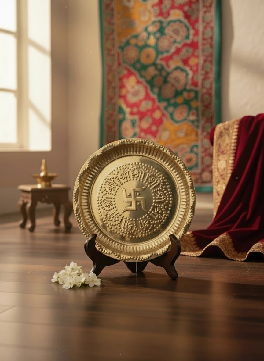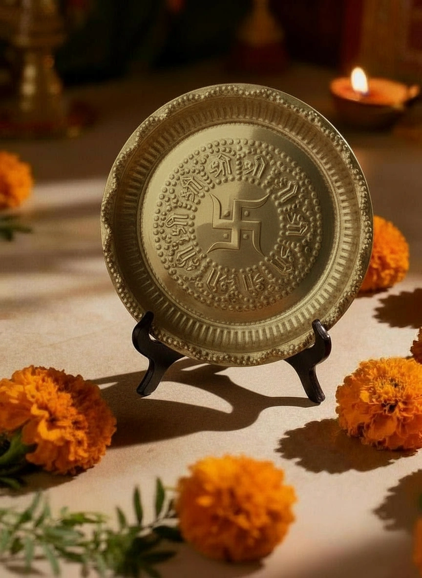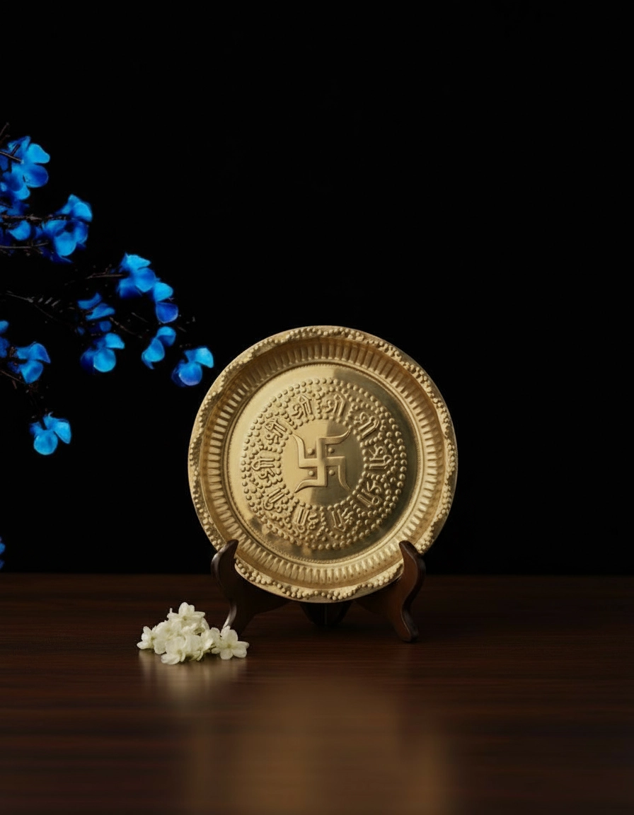 Name: Brass Pooja Plate Swastik Design for Pooja / Brass Pooja Plate | Bhog Thali