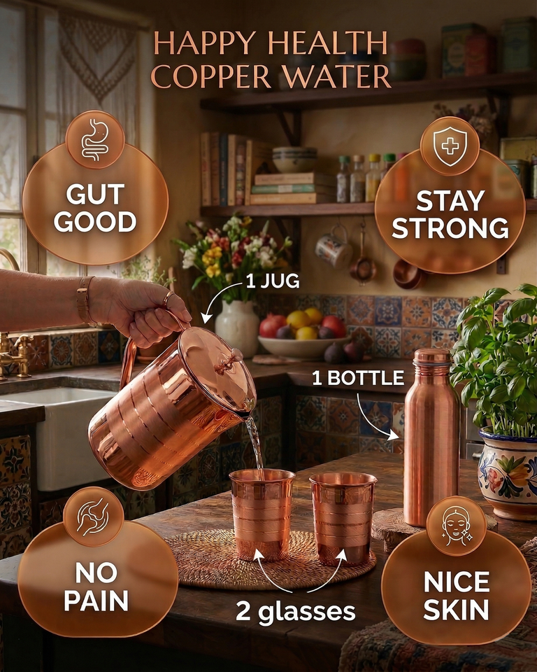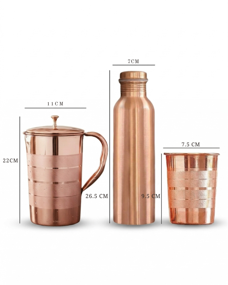 Upgrade your daily hydration with the SF Pure Copper Water Bottle, Jug & Glasses Combo Set.